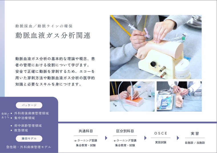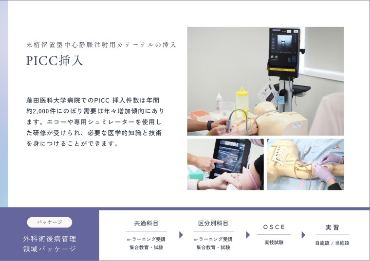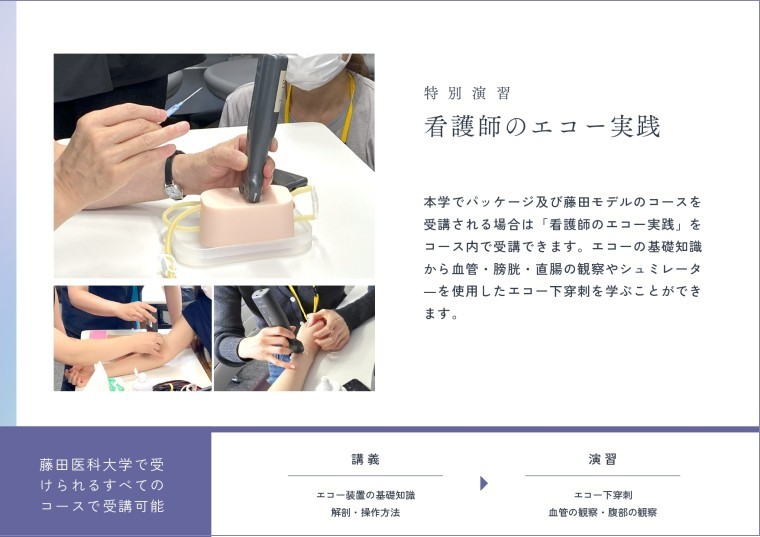 藤田医科大学の看護師特定行為研修の特徴は厚生労働省パッケージに藤田独自モデルを追加し各医療現場に合わせて特定行為を選択できる環境を整えています。講義は自宅でeラーニングを受講し、演習及び実習を集合教育として実施しています。また、臨床判断力を向上させる目的で、特別科目として、エコー実践の演習を組み込んでいます。詳しくは募集要項をご覧ください。
