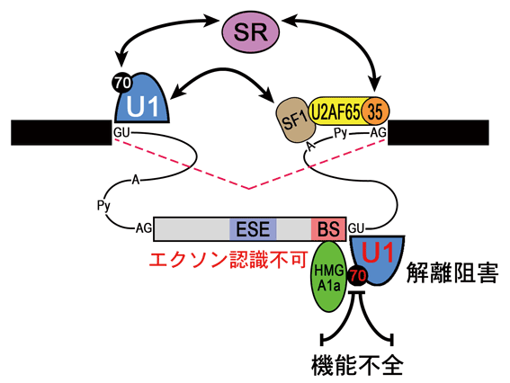 大多数の老人性アルツハイマー病は、4つの原因遺伝子に突然変異が認められない孤発性アルツハイマー病です。ところがその患者において、原因遺伝子の1つであるプレセニリン-2 (PS2)の異常スプライシングにより、エキソン5が抜けてしまっているmRNAが高頻度で観察されました。患者脳ではこの異常スプライシングの蛋白質産物PS2Vが蓄積し、神経細胞死を引き起こす危険要因の一つとなっているのです。私たちは、癌遺伝子としてよく知られていたHMGA1a蛋白質が、PS2のmRNA前駆体に結合して、この異常スプライシングをひき起こしていることを見いだし、その分子機構の詳細を明らかにしました(下図参照)。その分子メカニズムの主体となるHMGA1a–U1 snRNP–RNA複合体の構造解析を進めています。また、疾患の原因となっている異常スプライシングを引き起こしうる他のHMGA1aの標的遺伝子を探索しています。