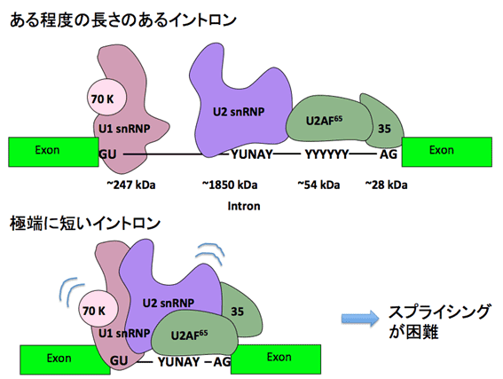 ヒトゲノムにおいて最小のイントロンは何塩基なのでしょうか?それらはその短さのために、スプライシング必須因子群が結合できる余地がないと思われます(下図参照)。一体どのようにスプライシングされているのでしょうか? 私たちは65塩基以下のGT-AGルール(イントロンの最初がGTで始まり、AGで終わる)に則したイントロンを探索し、現在のところESRP2遺伝子に存在する43塩基のイントロンが実験的に検証できる最小イントロンであることがわかりました。また、NDOR1遺伝子の49塩基とESRP2遺伝子の43塩基長のイントロンについてはGに富む配列がそのスプライシングに必須であることを示しました。さらに、HNRNPH1遺伝子の56塩基のイントロンはその周りのエキソン配列がスプライシングに必要であることが分かりました。つまり、短いイントロンはこれらの配列に結合する因子の力を借りてスプライシングされている可能性があります。これらをさらに詳しく解析することによって、今まで知られていないメカニズムの発見につながることを期待しています。
