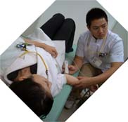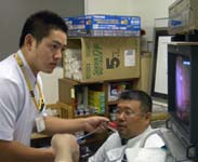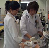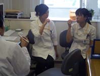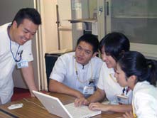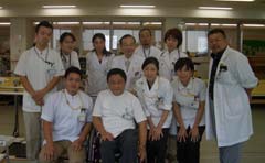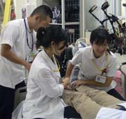 2日目も豊明キャンパスで口腔ケア,関節可動域訓練・移乗に関しての体験を行ってもらいました.口腔ケアは嚥下障害の患者だけでなく,実際の臨床で必要不可欠な事を知ってもらえたと思います.また,療法士による関節可動域訓練・移乗の「技」を伝授してもらい,前日の呼吸リハと共に感銘を受けていたようでした.さらにリハ医が行う検査の一つとして嚥下内視鏡検査も実際に検者として体験しました.実際に患者さんを検査することはできないため,毎年恒例になってきている私(清水)が被検者となりました.