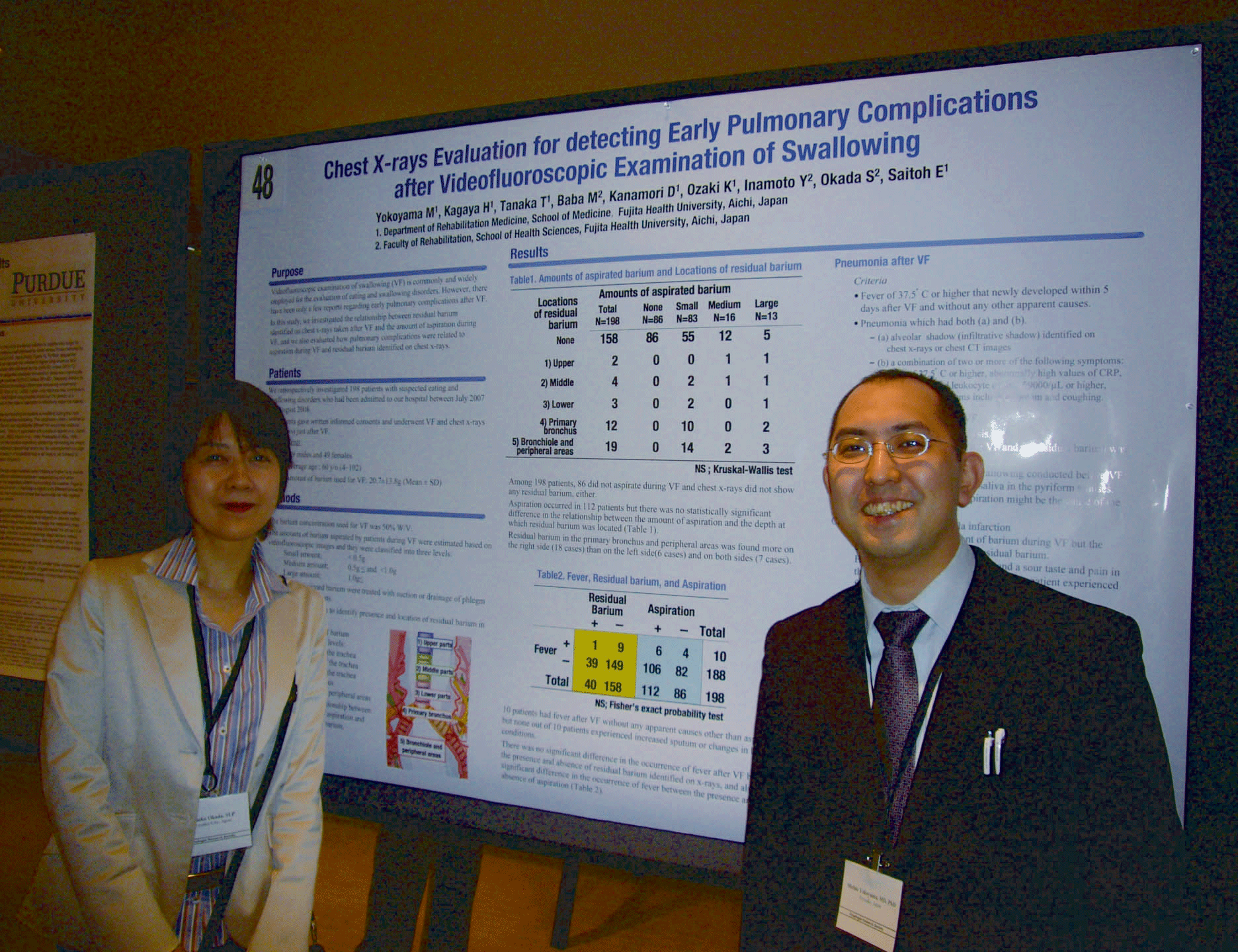 藤田リハビリ部門からの講演・発表演題 <Oral Presentation> ・Baba M, Inamoto Y, Saitoh E, Fujii N, Katada K, Yoshida S, Nakai T, Kanamori D, Okada S, Yokoyama M, Ozaki K: Initial Evaluation of swallowing image from 320-detector row computedtomography. <Poster Presentation> ・Okada S, Inayoshi N, Kagaya H, Inamoto Y, Saitoh E, Baba M, Yokoyama M: The possibility of oral feeding in patients with prolonged impaired consciousness. ・Yokoyama M, Kagaya H, Tanaka T. Baba M, Kanamori D, Ozaki K, Inamoto Y, Okada S, Saitoh E: Pulmonary Complication after Videofluoroscopic Examination of Swallowing. ・Inamoto Y, Fujui N, Baba M, Saitoh E, Yoshioka S, Okada S, Yokoyama M, Ozaki K, Ida Y, Nakai T, katada K: Kinematic Analysis of Swallowing using 320-Detector Row CT. ・Kanamori D, Kagaya H, Baba M, Yokoyama M, Ozaki K, Okada S, Inamoto Y, Saitoh E: Tongue pressure sensory distinguishes isolated pharynegeal swallow from consecutive pharyngeal swallow. ・Ozaki K, Kagaya H, Baba M, Yokoyama M, Okada S, Inamoto Y, Saitoh E, Marlis Gonzalez Fernandez, Uematsu H: Foods and Consistencies That are More Likely to Cause Aspiration during Videofluoroscopic Examination of Swallowing. |