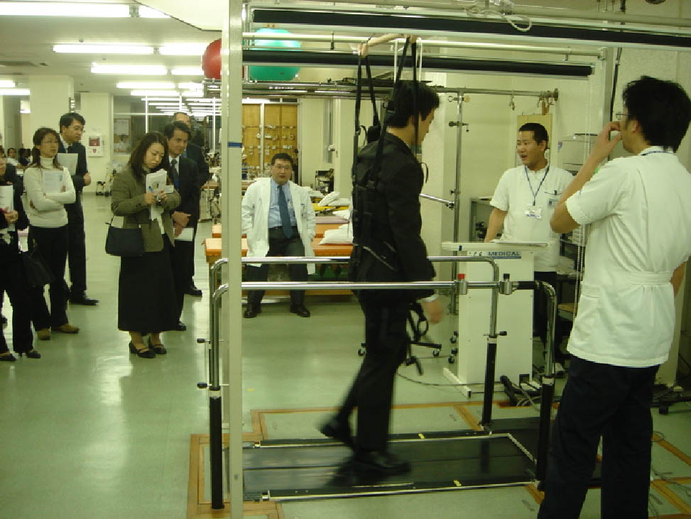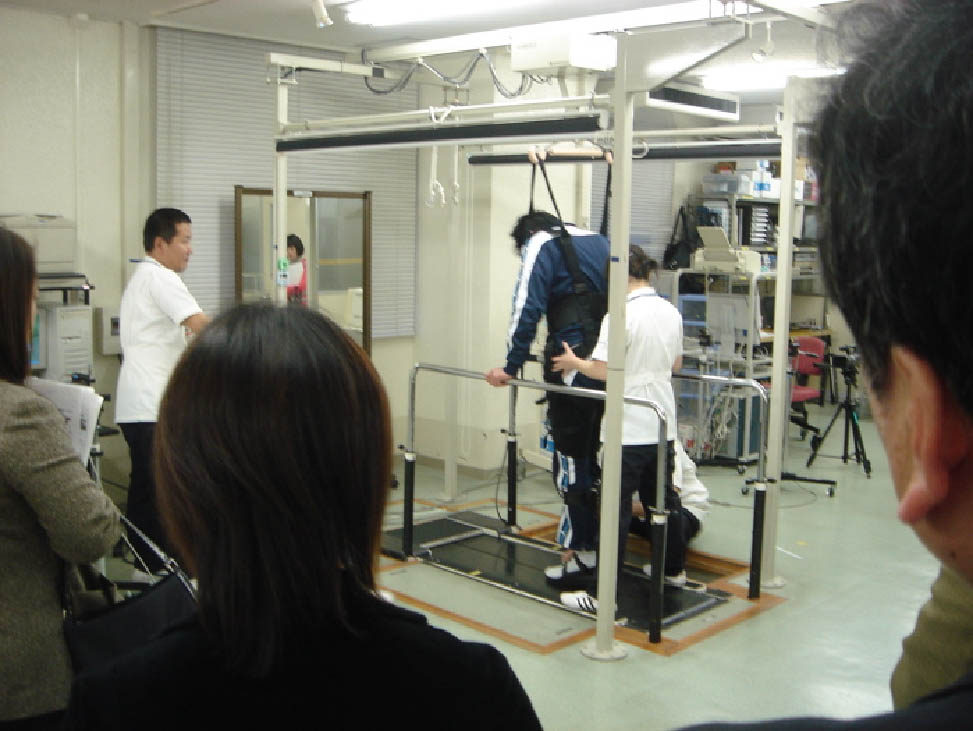 最後に、不全脊髄損傷患者の懸垂装置を用いた実際の歩行訓練場面を見学してもらいました。