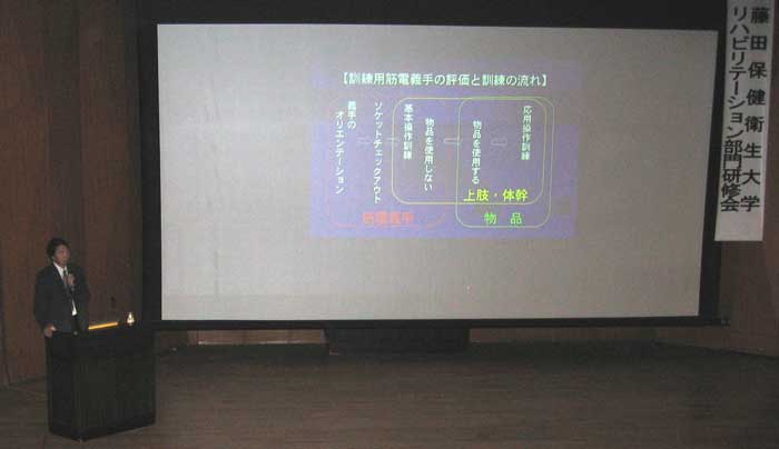 今回は主に筋電義手について講演してくださいました。過去の経験談などを交え、最先端の知識を御指導していただきました。スライド発表の後は、ビデオを使用し、義手を使用した方のIADLの様子を説明していただきましたが、特に、筋電義手で卵を割る映像はとても感動しました。