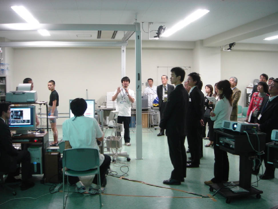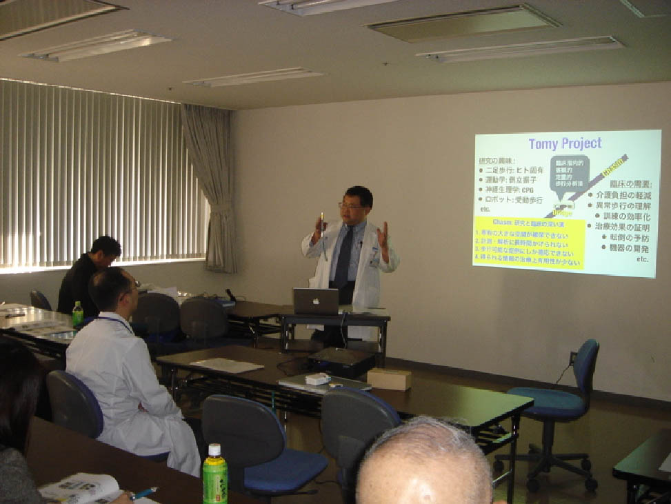 ◆リハ医学講座の加賀谷助教授によりトレッドミル歩行概論と、衛生学部リハ学科の寺西助教授によりトレッドミル歩行訓練歩行についての講義が行われました。 ◆ここでは、TOMY projectで開発したGait Analytic EMGとKinemaTracerについての説明も行いました。 |