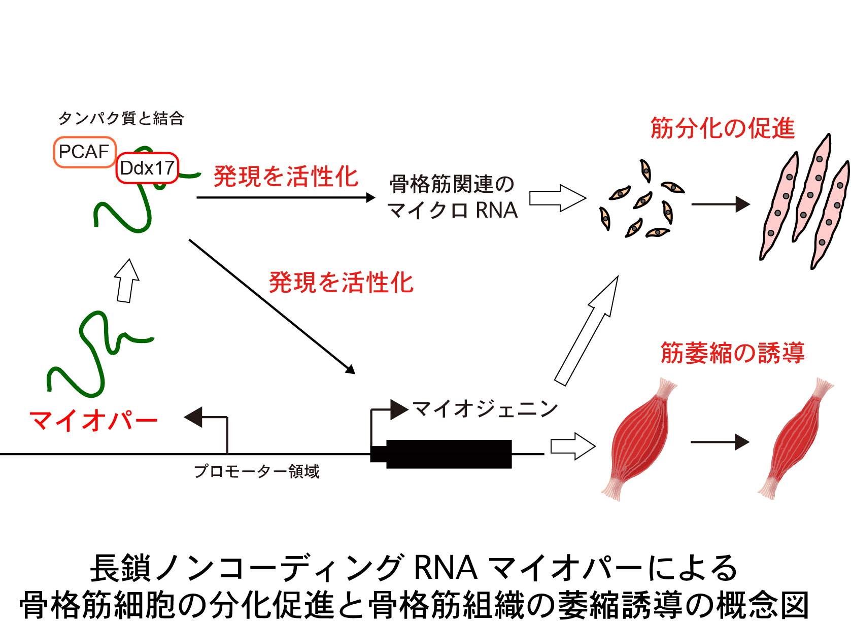 研究グループは、マウスとヒトの骨格筋細胞を用いてPCR法(ポリメラーゼ連鎖反応)による解析を行い、マイオジェニン遺伝子の発現の活性化に必要なDNA領域から長鎖ノンコーディングRNAが発現していることを発見し、このRNAを「マイオパー」と名付けました。また、マイオパーの発現をRNAiという手法で抑制した場合に、マイオジェニン遺伝子の発現が活性化されなくなり、マウス骨格筋株化細胞の筋分化が停止することがわかりました。RNA-seqと呼ばれる網羅的な遺伝子発現の解析手法を利用することで、マイオパーがマイオジェニン遺伝子の発現の制御とは別に、骨格筋関連の複数のマイクロRNAの発現も活性化していることがわかりました。さらに分子的な仕組みとしては、マイオパーが転写活性化補因子Ddx17とヒストンアセチル基転移酵素PCAFの相互作用に必要であることを見出しました。マイオジェニン遺伝子の発現は、骨格筋を支配する神経の損傷によっても活性化し、筋萎縮の引き金となることが知られています。研究グループは、マイオパーの発現が筋萎縮時に増加することを見出し、マイオパーの発現をRNAiにより抑制することで、マウス骨格筋組織におけるマイオジェニン遺伝子の発現の活性化を抑え、筋萎縮を緩和することに成功しました。