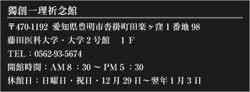 獨創一理祈念館|〒470-1192 愛知県豊明市沓掛町田楽ケ窪1番地98/藤田医科大学生・大学2号館1F/TEL:0562-93-5674/開館時間:AM8:30〜PM5:30/休館日:日曜日・祝日・12月29日〜翌年1月3日
