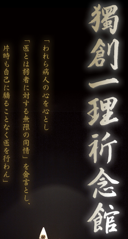 獨創一理祈念館「われら病人の心を心とし「医とは弱者に対する無限の同情」を金言とし、片時も自己に驕ることなく医を行わん」