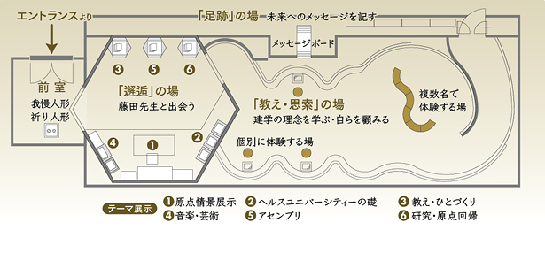 藤田学園のシンボルであるベンゼン環が描かれたエントランスホールでは、同窓会寄贈による「学生たちと談笑する総長先生」レリーフ像が来訪者を出迎えます。映像ユニットコーナーでは、映画「藤田啓介六つの遺産」と「藤田学園医療人育成の軌跡」をはじめ、開学から今日に至るまでの藤田学園にかかわる映像が観られます。