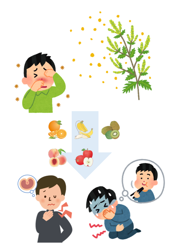 - その他、イネ科(オオアワガエリ、カモガヤ)・キク科(ブタクサ)の花粉症の患者さんではウリ科果物(メロン、スイカなど)、ヨモギ花粉症の患者さんではセリ科野菜(ニンジン、セロリなど)で食物アレルギー症状が出ると報告されています。
