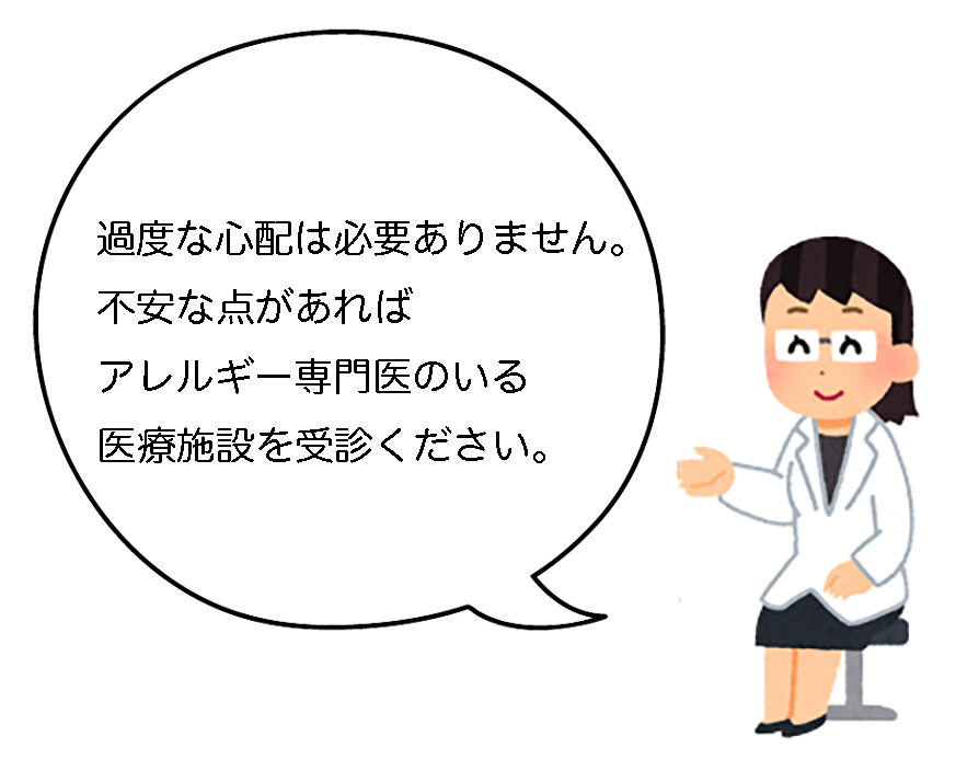 - 症状の多くは口腔、咽頭に限局していますが、稀に消化器症状(嘔吐、下痢等)やアナフィラキシーショックといった重篤な場合もあるので注意が必要です。
