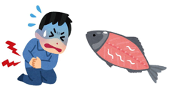 - 魚を食べたり、触ったりした後に出現する一般的な症状として、消化器症状(腹痛・下痢)や皮膚症状(蕁麻疹)などの即時型アレルギー症状が挙げられます。また、症状がひどい場合は、呼吸困難や血圧低下(アナフィラキシーショック)も引き起こすことが知られています。