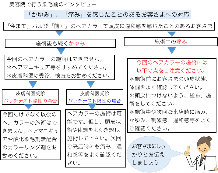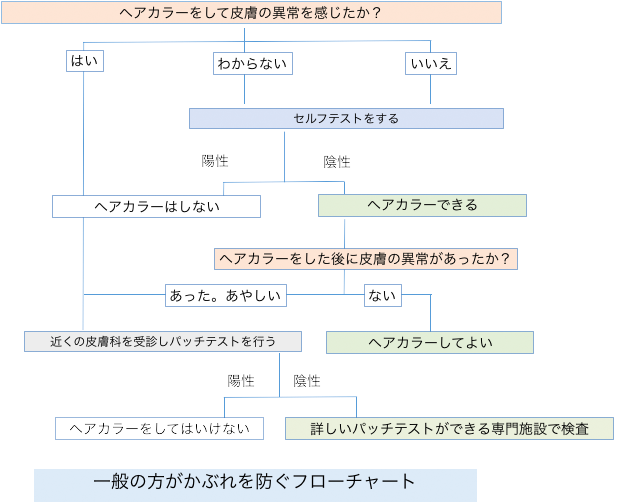 - もし、ヘアカラーでかぶれたことのある人は、皮膚科を受診ください。原因を正確に特定することで、ヘアカラーでかぶれた方にも、ヘアマニキュアや、非ジアミン系染毛剤などをご紹介することができます。