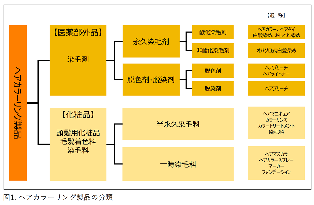 - ヘアカラーリング製品は、「医薬品、医療機器等の品質、有効性及び安全性の確保等に関する法律(薬機法)」によって法規定されています。医薬部外品である「染毛剤」と化粧品である「染毛料」があります。