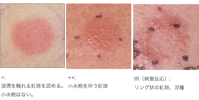 - 貼った部位一面が赤く(紅斑)触ると少し硬い(浸潤)と+ の陽性です。水が溜まっているような小水疱がでると、++の陽性です。