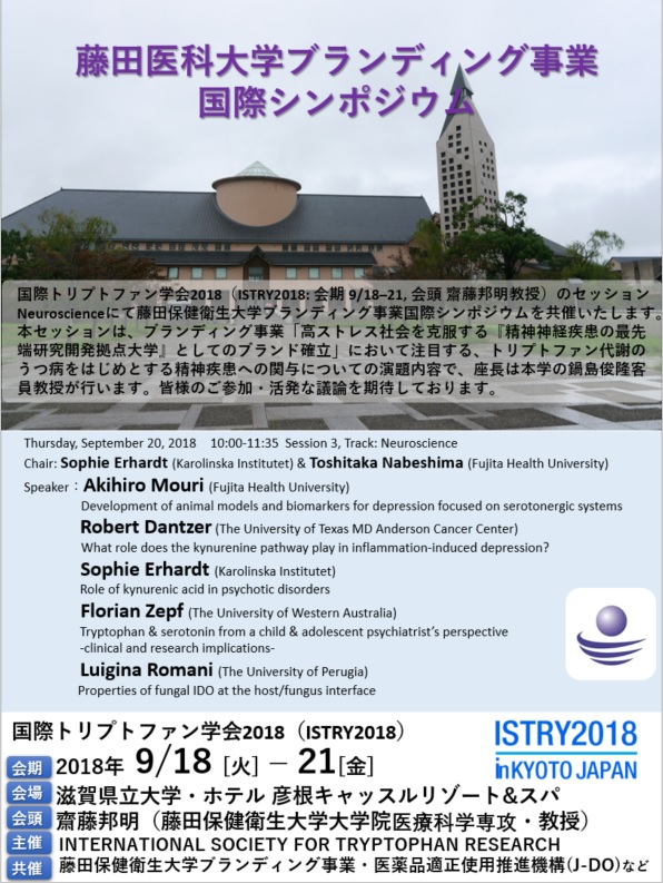 2018年9月20日、藤田医科大学ブランディング事業国際シンポジウムが国際トリプトファン学会2018(ISTRY2018: 会期 9/18–21, 会頭 齋藤邦明教授)のセッションNeuroscienceにて、開催されました。座長は本学の鍋島俊隆客員教授とカロリンスカ研究所 Sophie Erhardt先生が行いました。本セッションは、ブランディング事業「高ストレス社会を克服する『精神神経疾患の最先端研究開発拠点大学』としてのブランド確立」において注目する、トリプトファン代謝のうつ病をはじめとする精神疾患への関与についての演題内容で、本分野のスペシャリストの先生方の発表で大変盛況でした。本学からも毛利彰宏准教授が発表しました。