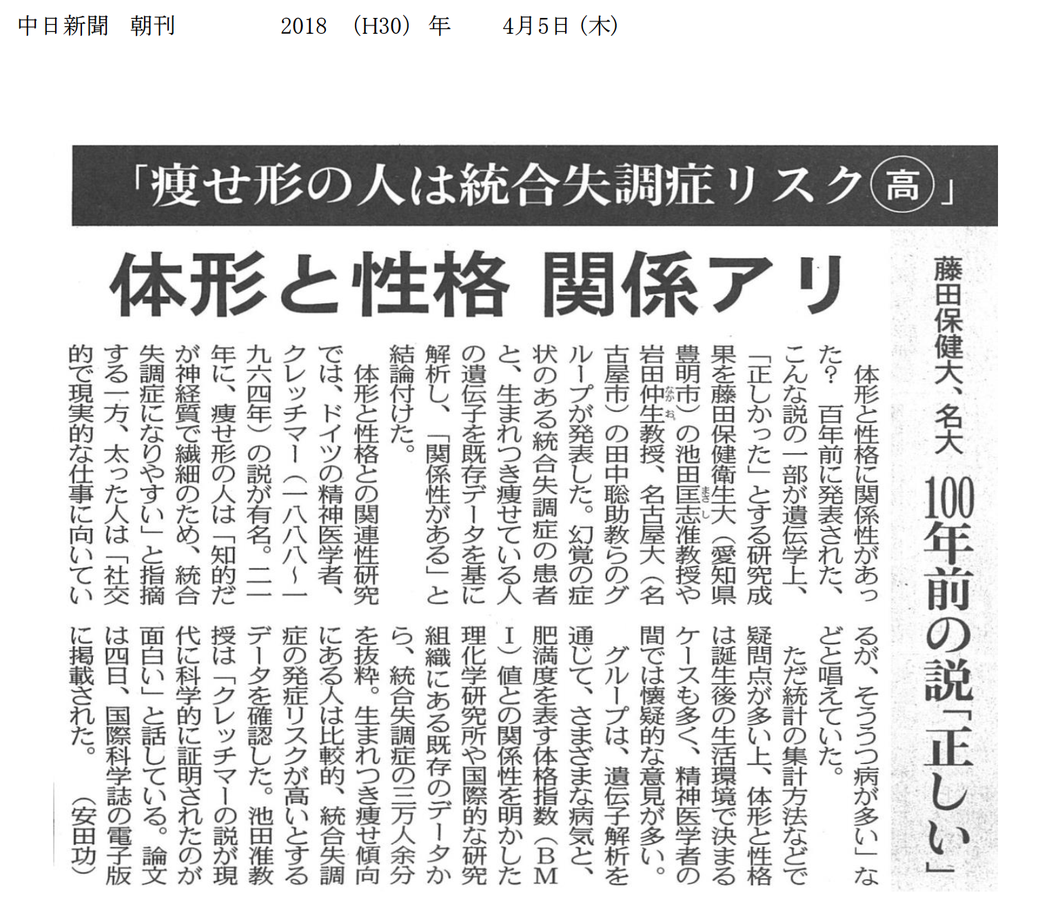 | 内 容 | 「痩せ形の人は統合失調症リスク高」体型と性格の関係 研究成果発表 | 統合失調症 実は「痩せ」と相関 8.8万人分遺伝子解析 | 統合失調症 「痩せ」と関連 | 統合失調症と低BMI 高い相関確認 |