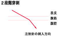A 注射針を皮下に5oほど進めた後注射針を立てて、腹腔内に針を進める(二段階穿刺)。