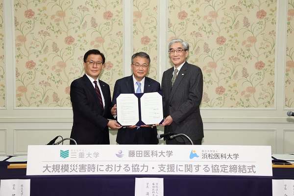 3月31日、藤田医科大学、三重大学、浜松医科大学の3大学は、南海トラフ地震等の大規模自然災害に備え、医療連携協定を締結しました。