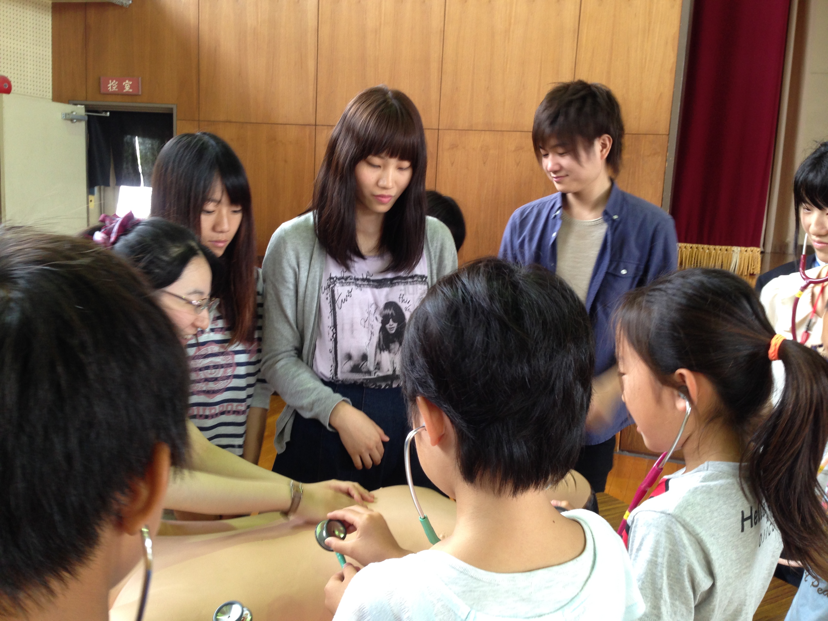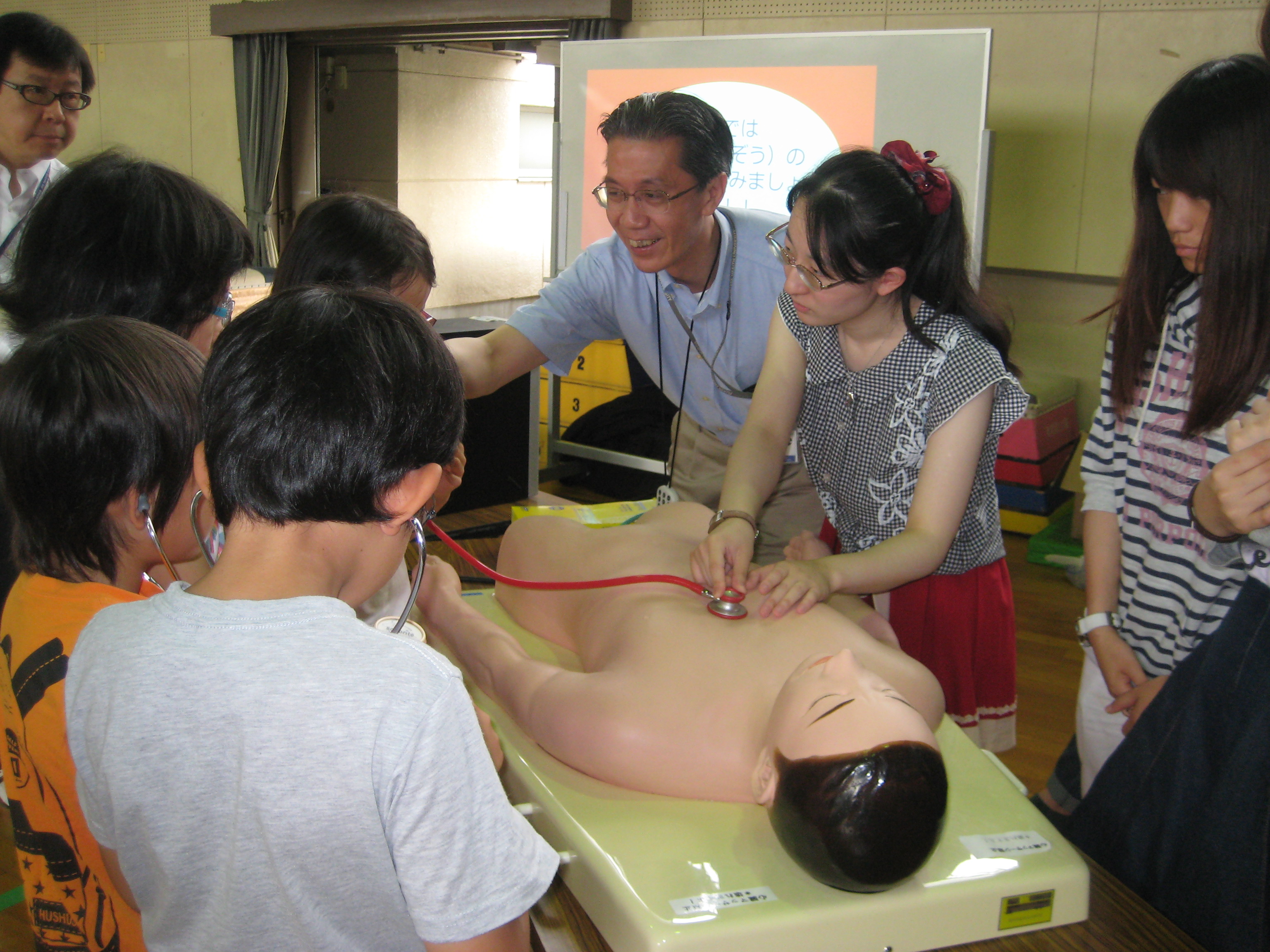 4~6年生の小学生が参加し、人型シミュレータを使用して聴診器で心音や呼吸音を聴いたり、学生の手作り模型を使って腸の長さを調べたりしました。子どもたちは普段学校ではできない実験に夢中で取り組んでいて、学生たちも熱心に教えていました。