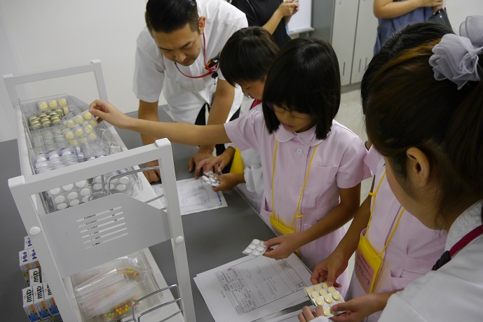 当日は3つのグループに分かれ、薬局での薬の一包化体験、低侵襲画像診断・治療センターやダヴィンチ低侵襲手術トレーニングセンターの見学、手洗いや心臓の音を聴く体験をしてもらいました。