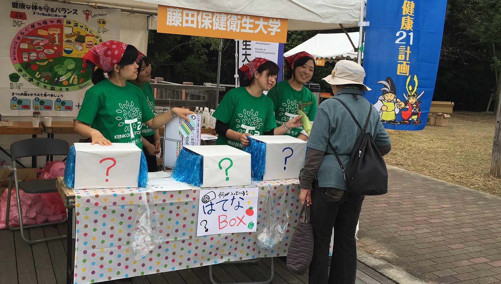 自然の中で健康増進を目指す「グリーンフェスタin 勅使水辺公園」(豊明市主催)が、10月22日に開催されました。本学の学生がアセンブリⅡの授業の中で、健康情報ブース、食育コーナー、健康運動教室を運営しました。