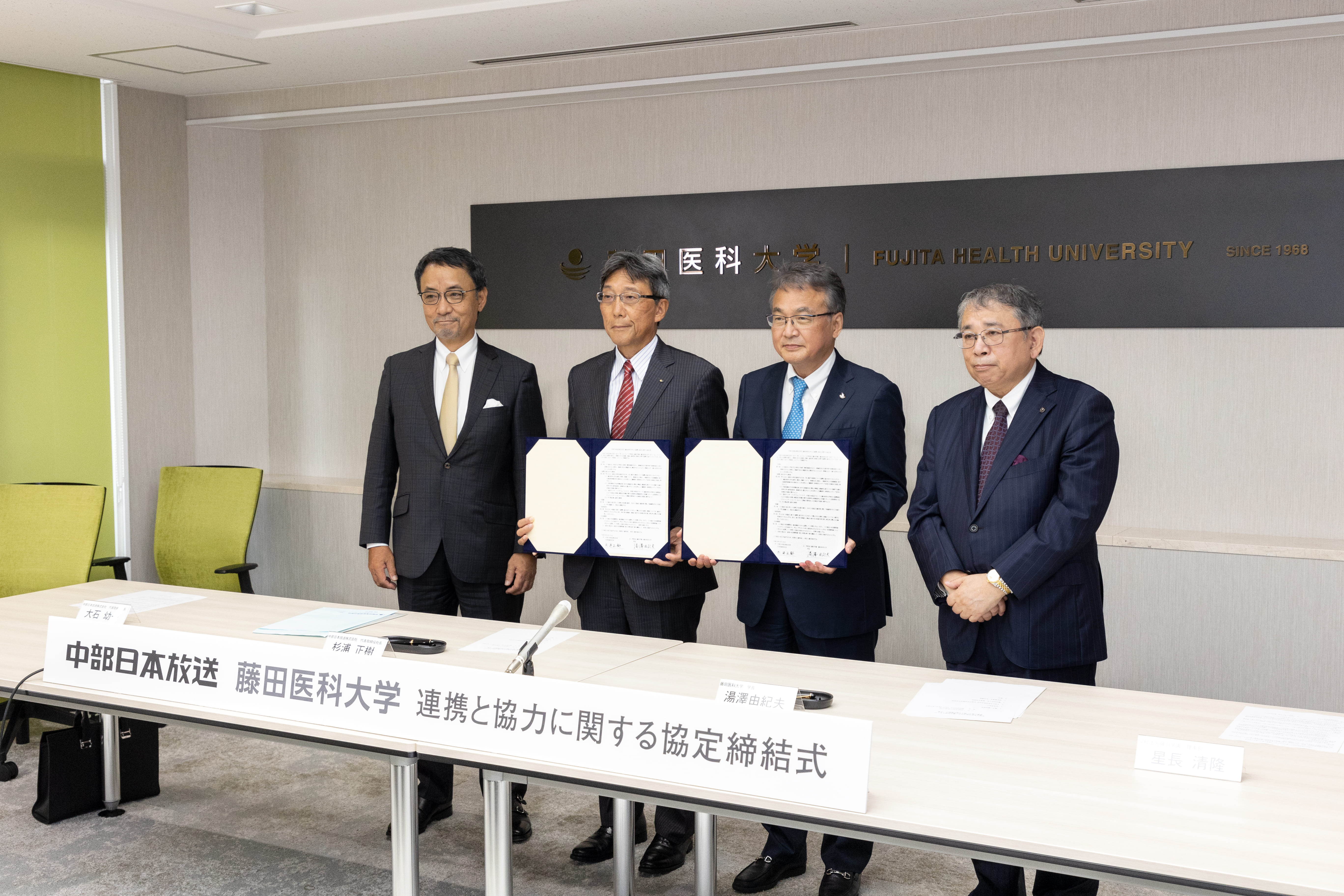 本学と中部日本放送株式会社は、地域における保健、医療、福祉等の多様な分野で連携・協力していくための協定を9月28日に締結しました。本協定により健康や医療に関する情報発信の強化やテレビ放送および院内ラジオ「フジタイム」の情報をさらに充実させ、より幅広い層の健康増進をめざしていきます。