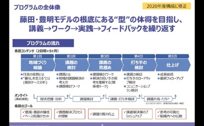 昨年度プログラム受講生である、小松市 角地氏、半田市 大崎氏、大台町 橋本氏へのインタビューを行った。参加時の想い、受講後の市町や自身の変化など、自身の経験に基づくプログラムの紹介・アドバイスを行った。