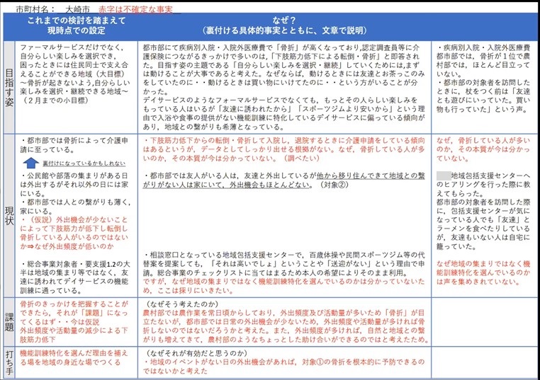 - 個別事例を追っていくと、生活の中の困りごとが見えてくるとわかったので、地域にどんな支えあいが存在するのかを把握していきながら、わがまちで何ができるかを考えていきたい。