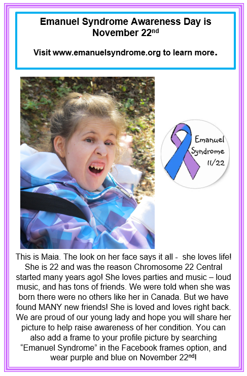 ・セントピエールさんが中心となって、11月22日を 「Emanuel Syndrome Awareness day」.pngとして祝福しようという活動をしています。それに応じて私たちも日本でそのような活動をしていこうと考えています。(2017/11/25)