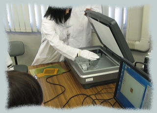 ラジオクロミックフィルムを用いた実験です.7-8人のグループに分けて実習を行います.