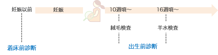 妊娠10週前後の胎盤の一部の絨毛細胞をとって検査する絨毛検査と、妊娠16週前後に羊水をとって検査する羊水検査があります。しかし破水や流産などの合併症を起こすことがあります。一方で、非確定的な検査ですが、採血でできる母体血胎児染色体検査(NIPT)も選択できます。出生前診断は、十分な遺伝カウンセリングを受けた上で、夫婦で検査をするかどうかを十分に話し合い自己決定することになります。出生前診断を受けることを医療者から強要することはありません。また妊娠中は定期的に超音波検査で胎児の様子を調べるため、広い意味で出生前診断に分類されます。