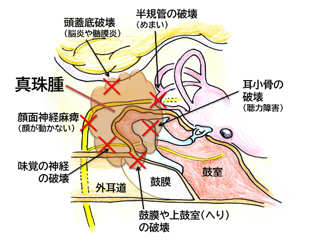 最も重大な中耳炎が、真珠腫性中耳炎です。鼓室から上の部分、”鼓膜の屋根裏部屋“のほうにかけて真珠腫といわれる「垢のかたまり」のようなものが出来てしまい、周囲をゆっくり破壊しながら徐々に進行します(先天性のものなど、例外もあり)。鼓膜や、鼓膜の上側の骨がえぐれて、そこから病変が奥にすすんでいきます。この部分の骨の中には、聞こえやバランスの機能、顔を動かす神経などとても大事なものが組み込まれていますから、放置するとこれらが破壊されてしまい重大なことになります。