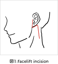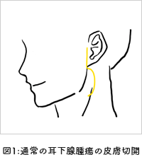 また耳下腺腫瘍の切除では、耳前部から頸部にかけて、もしくは耳後部を弧状に皮膚切開します。頸部の傷が審美性の面で問題となる場合には、髪の毛に隠れる位置の皮膚切開(facelift