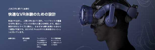 ヘビーVRユーザーのニーズを満たすように構築されたVIVE Proは、ビジネスに合わせて拡張でき、かつハードコアゲーマー向けの豊富な機能セットを提供できる展開が簡単なPC-VRシステムです。 着席環境から広大なマルチユーザー展開まで、VIVE Proは高品質の視覚的忠実度、強力なオーディオ、没入感を提供します。また、VRフェイシャルトラッカーと合わせることでリアルな表情と口の動きを正確に捉えます。意図や感情をリアルタイムで読みます。ほぼゼロの遅延のおかげで、口の動きと声が一致します。教育、医療、およびクリエイティブなアプリケーションにおいて人の表情を反映させ新しい次元に導きます。