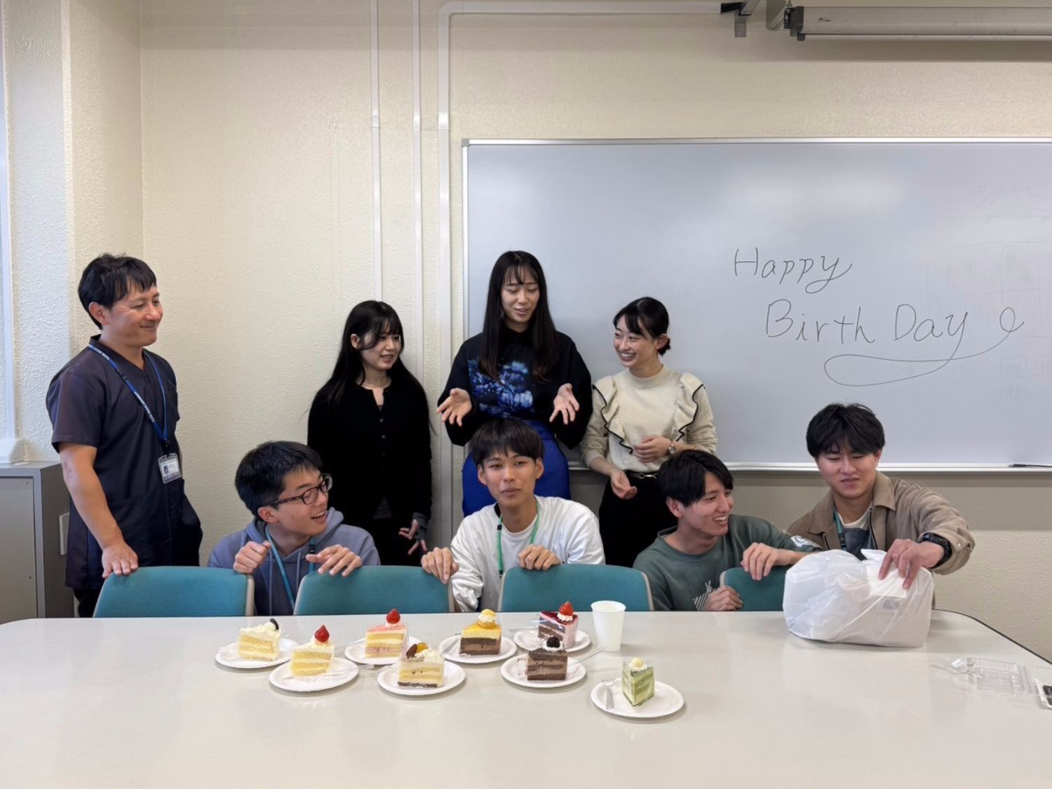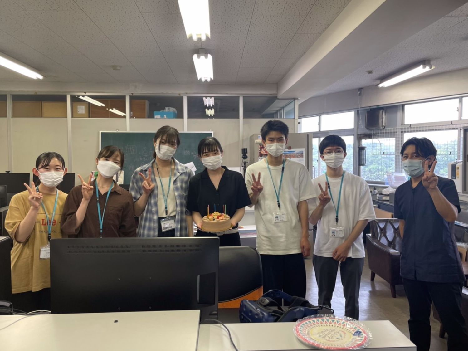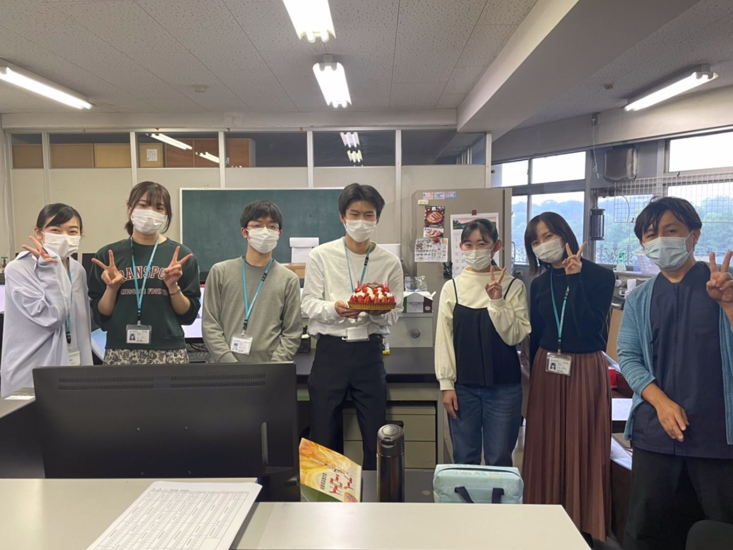 卒業研究生の誕生日に集合写真の撮影です。お誕生日おめでとうございます。皆様にとって実りのある1年であることを切に願っております。また、私の誕生日も祝っていただきありがとうございました。