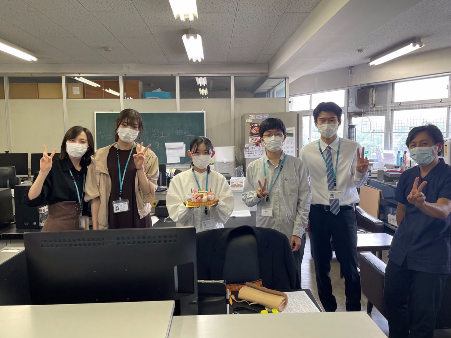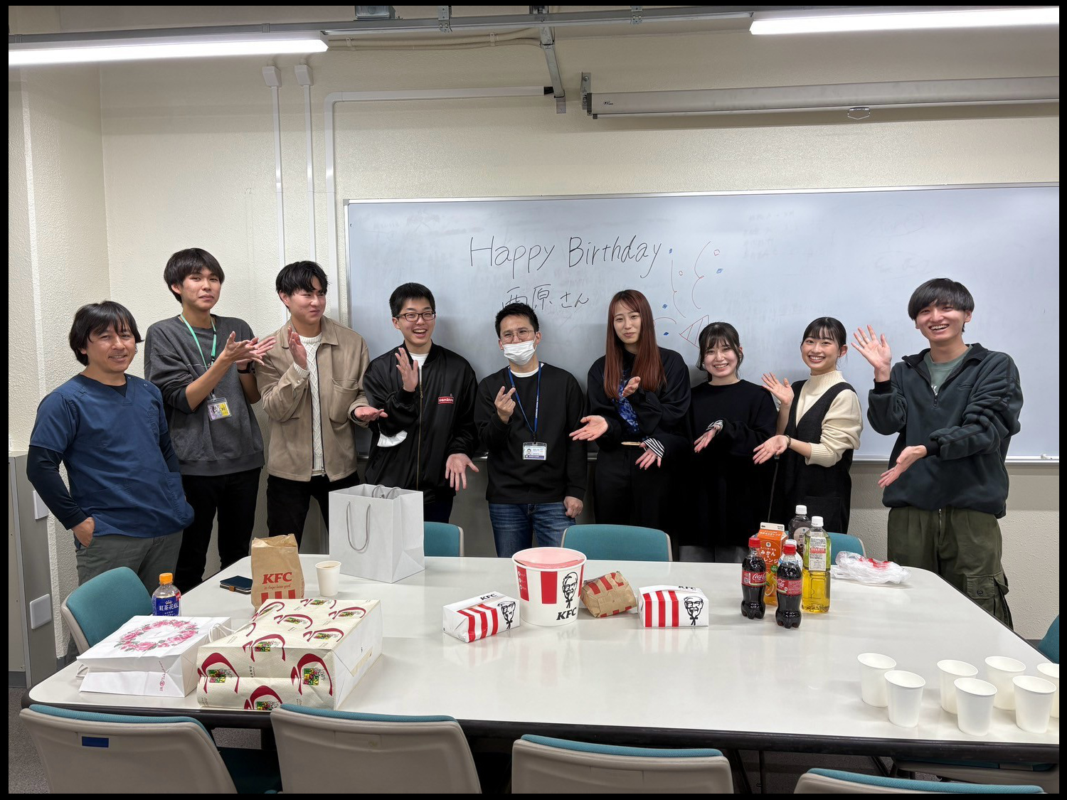 卒業研究生の誕生日に成長の証としての集合写真撮影です。お誕生日おめでとうございます。皆様にとって実りのある1年であることを切に願っております。今後も色々なことにチャレンジしてください。