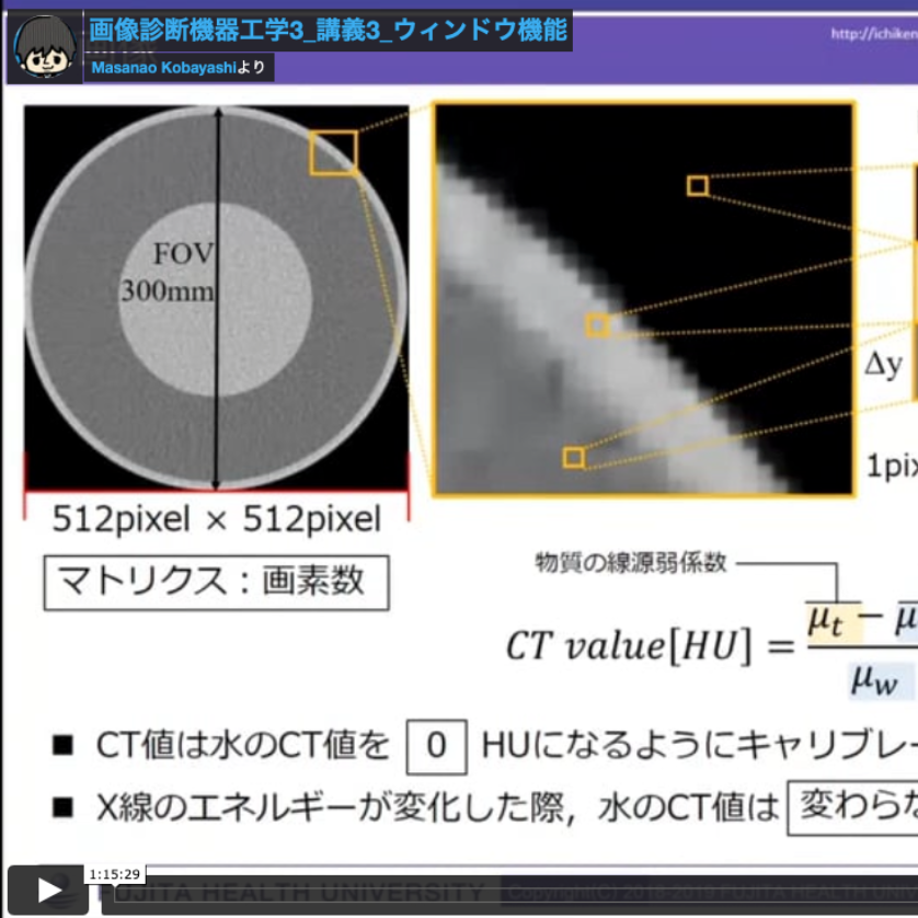 X線CT撮影技術学(2024年度)の講義動画になります。X線CT装置の構造、画像再構成、精度管理等に関する説明をしています。講義の終了に合わせて動画をアップしていきます。