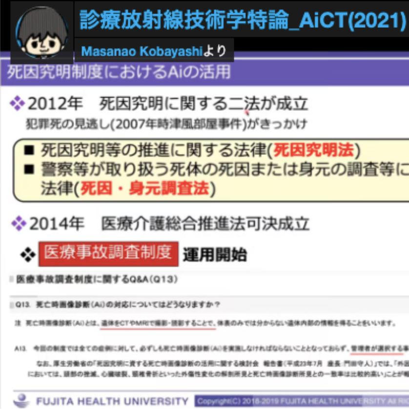 診療放射線技術学特論(2023年度)の講義動画(1コマ)になります。オートプシー・イメージングX線CT検査に関する解説をしています。講義の終了に合わせて動画をアップしていきます。