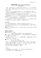早期臨床体験(ECE)- 220 -早期臨床体験(Early Clinical Exposure)<1学年必修科目> 卒業後、大部分が臨床医としての道を選ぶ本学医学部生に対して、入学した早期の段階より医療(臨床)の現場を体験させることを目的として行われるのが、Early Clinical Exposure である。 学生がグループ毎に大学病院内の各部門において、その日常業務を見学・体験する。 大学病院各部門の現場体験をすることにより、近い将来、医学部に入学したという実感と尊敬されるべき医師となるための自覚を持たせることを目標とする。 医学的知識をほとんど持っていない時期に行われる実習であるため、専門的な知識や手技の修得を目的としたものではなく、チーム医療の実践を学ぶために必要な考え方や態度を身につけ、学生自身が今後何をなすべきかを自覚させる。 さらに年間を通して学生が交代で大学病院中央玄関前に立って、患者・家族に対する挨拶と他職種と共同して必要に応じた援助を行い、接遇の基本を学ぶ。[教育目標]○チーム医療の重要性を理解し、医療従事者との連携を図る能力を身につける。○患者と医師の良好な関係を築くために、患者の個別的背景を理解し、問題点を把握する能力を身につける。●医師になるための動機付けを高め、チーム医療の実際を学ぶために必要な考え方や態度を身につける。[学習目標(到達目標)]●病院の機能を知る。(知識)看護部・事務局・臨床検査部・食養部・放射線部・薬剤部●チーム医療を支える様々な医療職に触れ、チーム医療の必要性を理解し、臨床現場を見学・体験する。(知識・態度) ○医療の現場におけるコミュニケーションの重要性を理解し、信頼関係の確立に役立つ能力を身につける。(知識・態度)●社会人としてのマナーを守る。(態度)自己紹介、挨拶、時間の厳守、服装○医療チームの構成や各構成員(医師、歯科医師、薬剤師、看護師、その他の医療職)の役割分担と連携・責任体制について説明し、チームの一員として参加できる。(態度)○患者と家族の精神的・身体的苦痛に十分配慮できる。(態度)○患者に分かりやすい言葉で対話できる。(態度)[ 評 価 ] 集合時間の遵守、服装、実習態度、レポート内容などから総合的に評価する。 なお、体験学習となるため再試験は原則行わない。