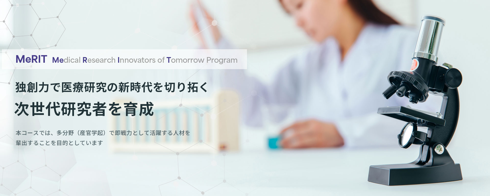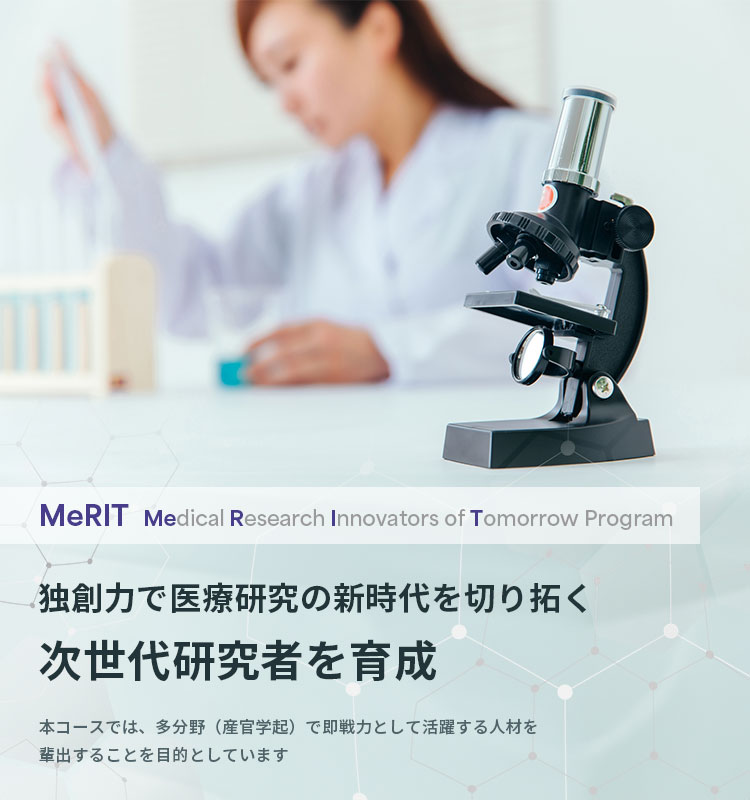 本学では、医療・生命科学分野の未来を担う次世代研究者の育成を目的として、大学院博士課程・博士後期課程の学生を対象に「MeRIT(Medical Researcher Innovation and Training)コース」を開設しました。本コースは、国立研究開発法人 科学技術振興機構(JST)が推進する「次世代研究者挑戦的研究プログラム」に採択された取り組みであり、優秀な大学院生が独創的な発想と挑戦的な姿勢で研究に取り組むことを力強く支援します。
