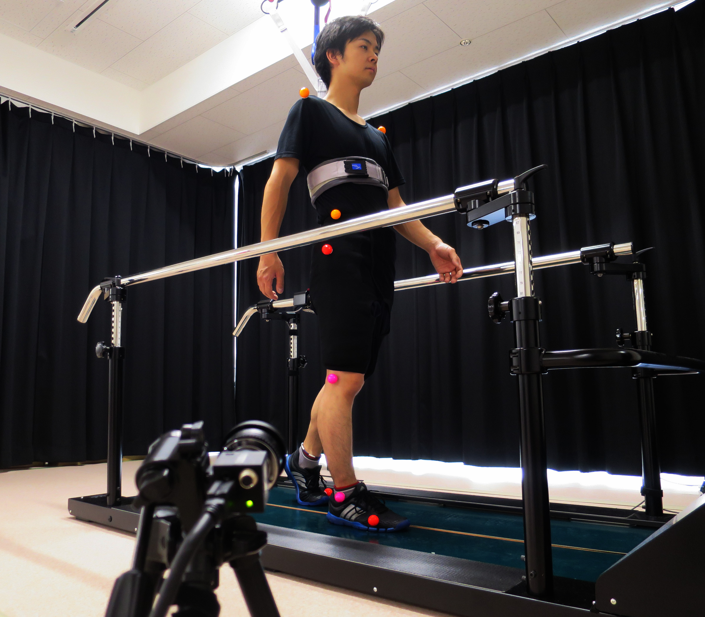 被験者にマーカを貼付し、歩いている姿をカメラで撮影してパソコンに取り込みます。取り込んだ映像をパソコン内で解析し、マーカが動いた量を算出します。