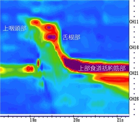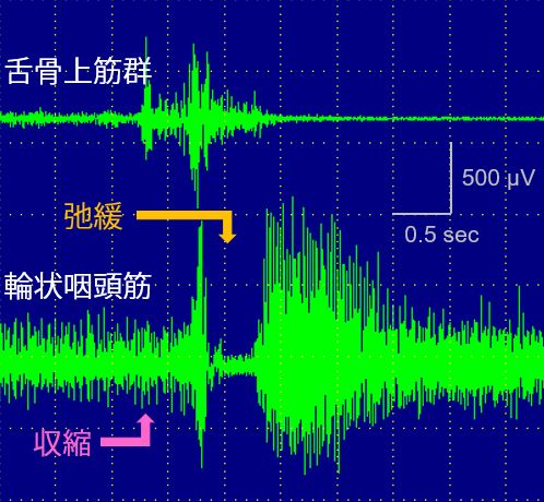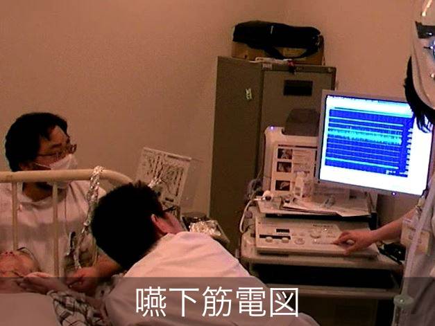 嚥下関与筋の安静時電位と嚥下時の運動単位電位を記録することにより神経原性変化、筋原性変化を鑑別します。また、多チャンネル筋電図測定を行うことで嚥下関与筋の一連の協調運動、例えば舌骨上筋群の収縮から輪状咽頭筋の弛緩という一連の協調的かつ連続的な運動が正常に起こっているかを鑑別します。