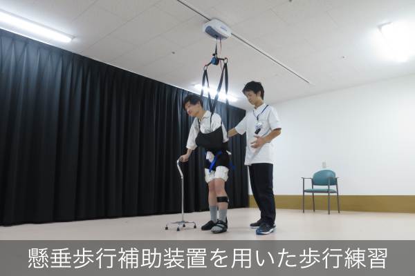歩行の介助量が多い患者さまでも懸垂装置を併用することで早期かつ安全な歩行練習が可能となります。当院では平地とトレッドミル上に懸垂装置を備えています。
