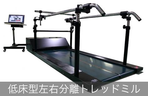 トレッドミルは歩行練習をするための機器です。このトレッドミルの特徴は歩くためのベルトが2つに分かれていることです。左右のベルトを違う速度で動かすことができるため、歩行の非対称を修正しながら練習を行うことができます。