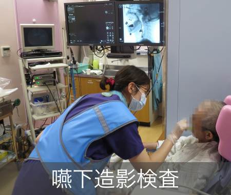 食べたり飲んだりしたものを飲み込むことを「嚥下(えんげ)」といいます。様々な病気の影響でうまく飲み込めずに気管や肺に食べたものが入ってしまうことがあります。これを「誤嚥(ごえん)」といいます。誤嚥している状態が続くと肺炎を発症する危険性があります。この検査では、誤嚥の有無、誤嚥を防ぐためにどのような工夫が必要かを確認します。