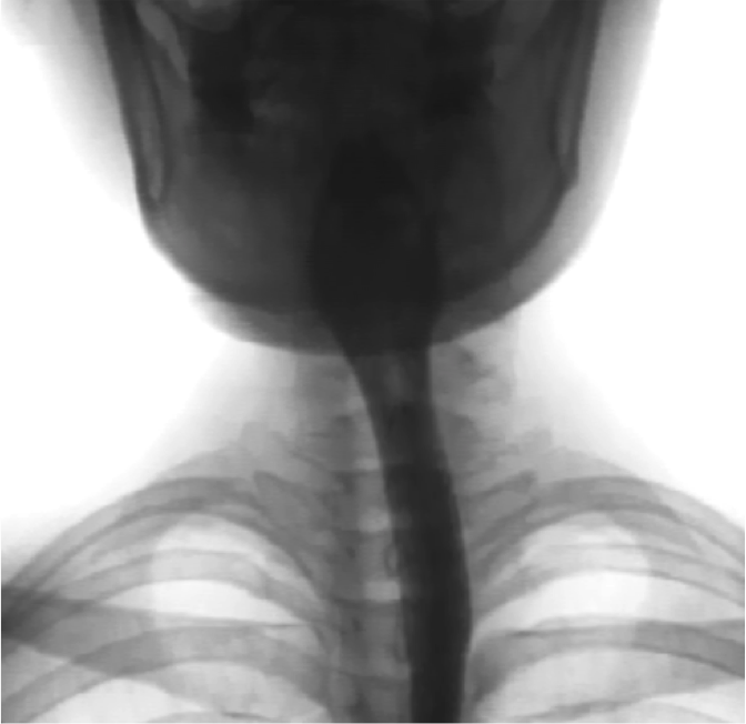 レントゲン室で車椅子に座った状態でバリウムの入った数種類の検査食品を食べたり飲んだりしていただく検査です。口に入った検査食品がどのように送り込まれていくかをレントゲンで確認します。