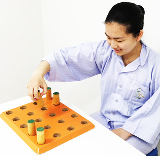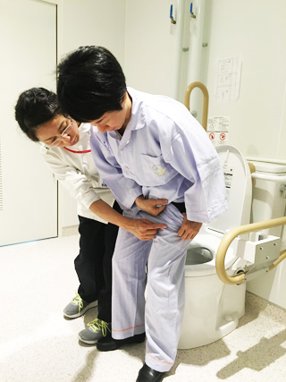 作業療法は日常生活動作(食事動作、更衣動作、トイレ動作など) の自立度向上を目標に訓練します。また、在宅復帰に向けた家屋環境の整備や自助具、福祉用具の導入に関するアドバイスもしています。