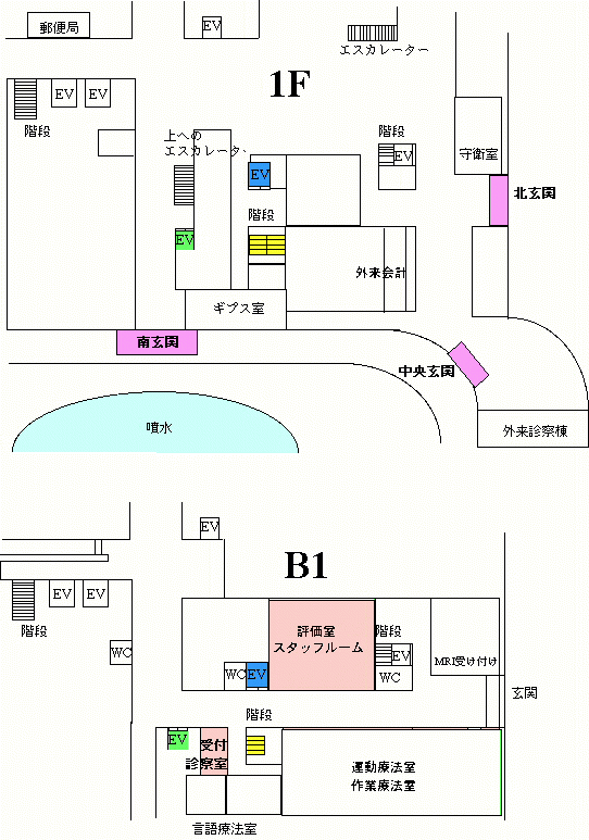 | 病院内リハビリテーション部までの地図 | 大学病院内の地図です | リハビリ外来診察室・訓練室・療法士スタッフルームは2号棟地下1階へおこしください。 |
