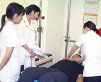 2日目も豊明キャンパスで口腔ケア,関節可動域訓練・移乗に関しての体験を行ってもらいました.口腔ケアは嚥下障害の患者だけでなく,実際の臨床で必要不可欠な事を知ってもらえたと思います.また,療法士による関節可動域訓練・移乗の「技」を伝授してもらい,前日の呼吸リハと共に感銘を受けていたようでした.さらにリハ医が行う検査の一つとして嚥下内視鏡検査も実際に検者として体験しました.実際に患者さんを検査することはできないため,毎年恒例になってきている私(清水)が被検者となりました.