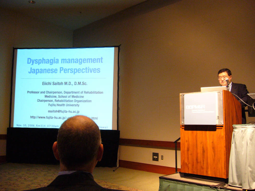 ◆下記の才藤先生の講演では,最初にPalmer先生が,嚥下リハに対する生理学的なアプローチのお話をされ,その後,才藤先生が日本における摂食障害のマネージメントとその展望に関して述べられ,最後に再度Palmer先生がお話しされるという順序でした. ◆Palmer先生が「米国では,嚥下障害に対するリハが発症後早期に集中しており,慢性期に対してのアプローチが医療経済的に理由から不足している」と述べておられたのが印象的でした. |